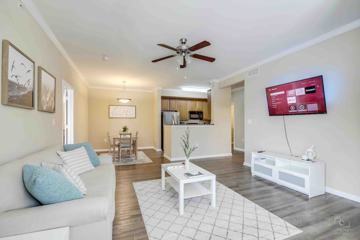 - Smoking (of any kind, including vaping): $200 fine + any other fees for damages. The maximum occupancy limit is 6. - Parties: $500 fine. There will be a $75 fine per person/per night for every person that is not on the reservation without prior approval. There is a motion activated exterior Video Doorbell Camera. There is a Noise Detector- Excessive Noise: First notification= warning, Second notification= Cancellation of reservation without refund. Device Tampering: $250 fine. Disconnecting the device/wifi will result in the cancellation of your reservation without refund. Blocking the video doorbell camera to allow extra guests to enter the property will automatically lead to cancellation of your reservation without refund. No glitter, Silly String, Confetti, Hair Dye, Bleach, or excessive trash- There will be an additional $150 cleaning fee + any damages if this is left behind. Do not move or disassemble furniture or décor. Two parking passes will be provided and need to be immediately hung from your rearview mirror in order to prevent you from being towed. The hosts nor the complex will be held responsible if your vehicle is towed. Do not park in covered, reserved or handicapped spots. There is a $50 charge for each parking pass that isn’t returned when you leave. A key fob will be provided to gain access to the pool area and gym. If it is lost or damaged, there will be a $200 fee. $150 fee for every tv remote that isn’t returned upon checkout. We will not be held responsible for any power outages, internet outages, or pool/hot tub maintenance as these are things beyond our control and no refunds/discounts will be issued. DO NOT CONTACT THE MANAGEMENT/LEASING OFFICE AT ANY TIME! If you bring a pet without approval, there will be a $500 fee. No third-party bookings allowed. The person on the reservation will be held responsible for all charges and any damages incurred during the course of your reservation, and there will be no chargeback awarded at any time. Your checkout time is 11 am. Failure to checkout on time will result in a fee of $250 and this fee does not award you an additional night. You will be considered trespassing if you stay 10 minutes past your checkout time. We request that locals contact us prior to booking. If there is a maintenance issue that arises, the maintenance team and/or host will request to enter the space to resolve the issue. You recognize that by booking with us you agree to all of the rules, guidelines, and policies shown within the listing, terms of the lease, and complex policies, and that failure to follow these things could result in cancellation of your reservation without refund. You recognize that you are staying here as a guest, and there is no tenant/landlord relationship. We do not allow mail to be forwarded during your stay.